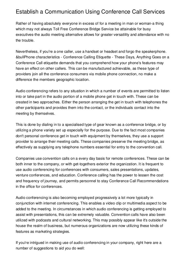 Free Conference Calls from image.slidesharecdn.com The default phone number of your conference bridge defines the caller id that will be used when an outbound call is placed by a participant or the organizer from within a meeting. A paid conference call service can save you up to 50% off the eventual charge of a free conference call. A vonage expert will get back to you shortly.